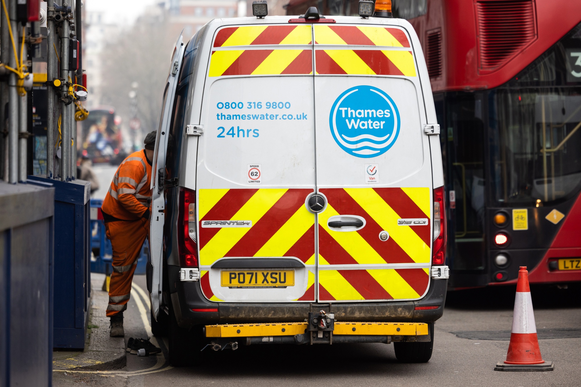 一辆泰晤士水务有限公司的货车停在英国伦敦的一个工作地点。