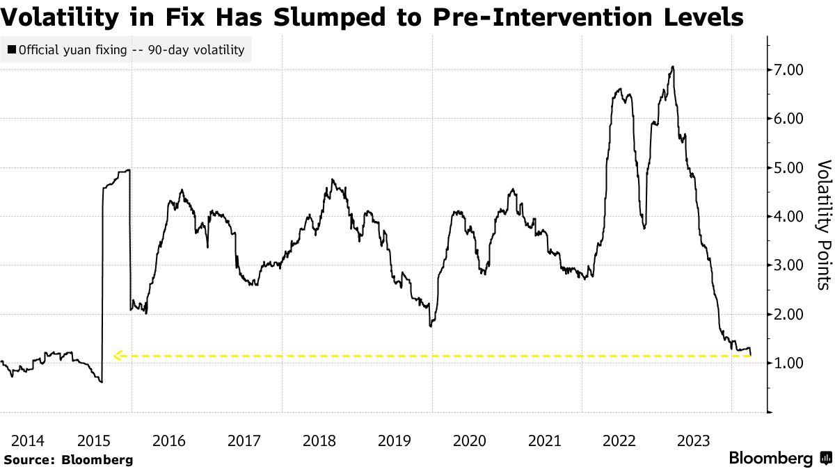 中国人民银行今年将每日汇率保持在如此狭窄的范围内,以至于固定汇率波动的指标已降至2015年人民币大幅贬值之前的最低水平。