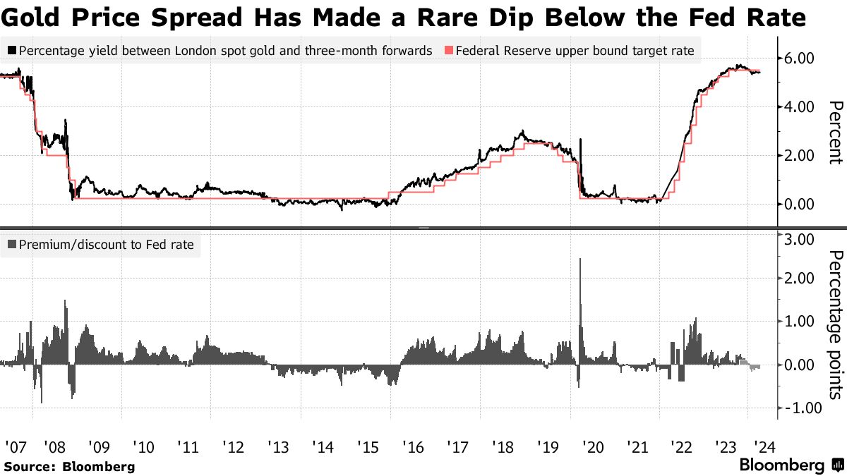 这个想法也可以解释最近几周黄金市场中另一个奇怪的变化 —— 一个备受关注的黄金价格差价与美联储利率之间的关系。
