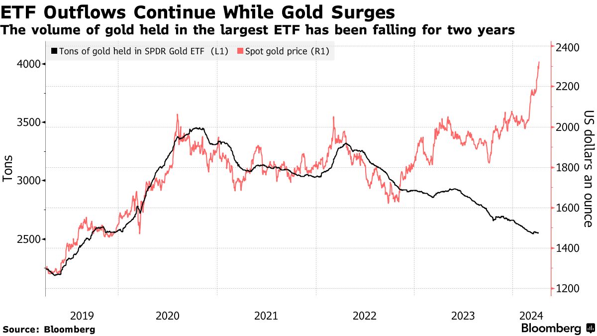 “这是我在ETF领域见过的更奇怪的现象之一,”ETF Store的总裁Nate Geraci说道。“特别有趣的是,黄金需求在其他渠道上非常强劲,比如央行购买和个人以及私人投资者的直接购买。”