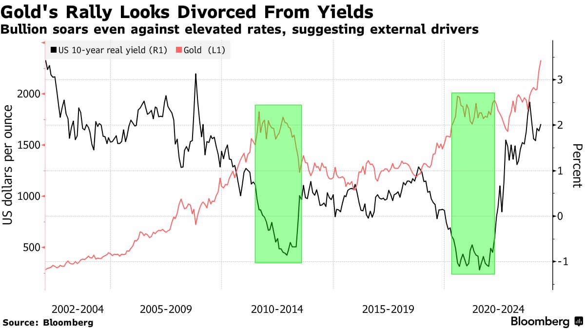 上周黄金的疯狂涨势,使这种贵金属飙升至每盎司超过2300美元,让许多旁观者感到惊讶,因为国债收益率上升——通常对金条构成阻力。这个难题表明有更强大的因素在起作用,央行购买力强劲,中国消费者需求增加,都推动了黄金的势头。虽然在当前超买水平可能会出现短期调整,但前景大多看涨。软期货头寸表明还有更多的投机资金可以推动进一步涨势,而备受期待的美联储降息转向——一旦发生——可能会导致投资者再次涌向黄金支持的交易所交易基金,这是在数月的资金外流之后。