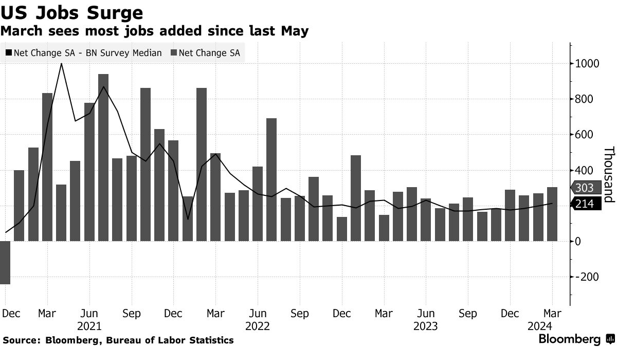 随着美国强劲的就业数据,交易员减少了对今年美联储大幅降息可能性的预期,美国国债收益率飙升。失业率降至3.8%,工资增长稳健,劳动参与率上升,突显推动经济的劳动力市场的强劲。 收益率激增。