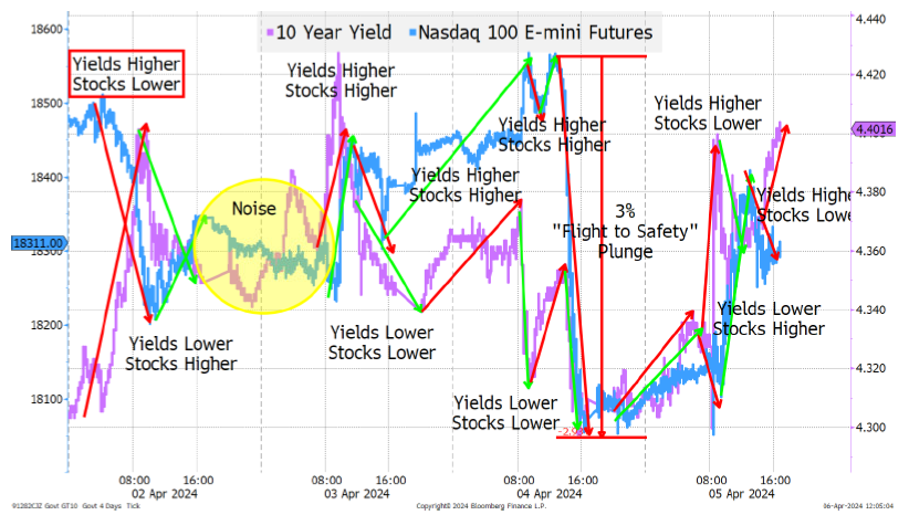 奇怪的是市场对所有这些的反应。上周债券收益率上升(如果利率可能上升是合乎逻辑的),股市小幅下跌,这也可能是对较高收益率的合乎逻辑的反应。但市场对此的反应确实很奇怪。以下图表是由Academy Securities的Peter Tchir从彭博终端生成的,跟踪了整个周的10年期国债收益率和主要是大型科技股的纳斯达克100指数的表现。两者都没有明显的趋势,并且关系多次发生变化: