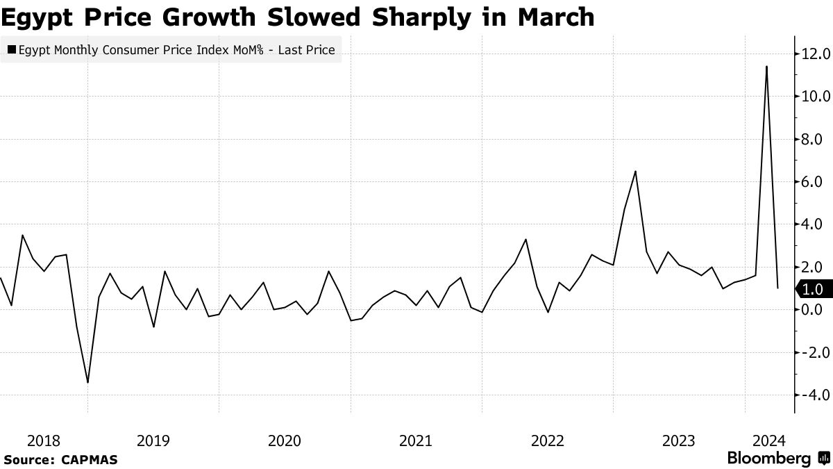 国家统计局CAPMAS周一表示,与2月份的35.7%相比,3月份城市地区的消费者价格同比上涨33.3%。按月计算,价格上涨了1%,较2月份的月度涨幅大幅下降。根据彭博社编制的数据,月度涨幅是自10月以来最低的。