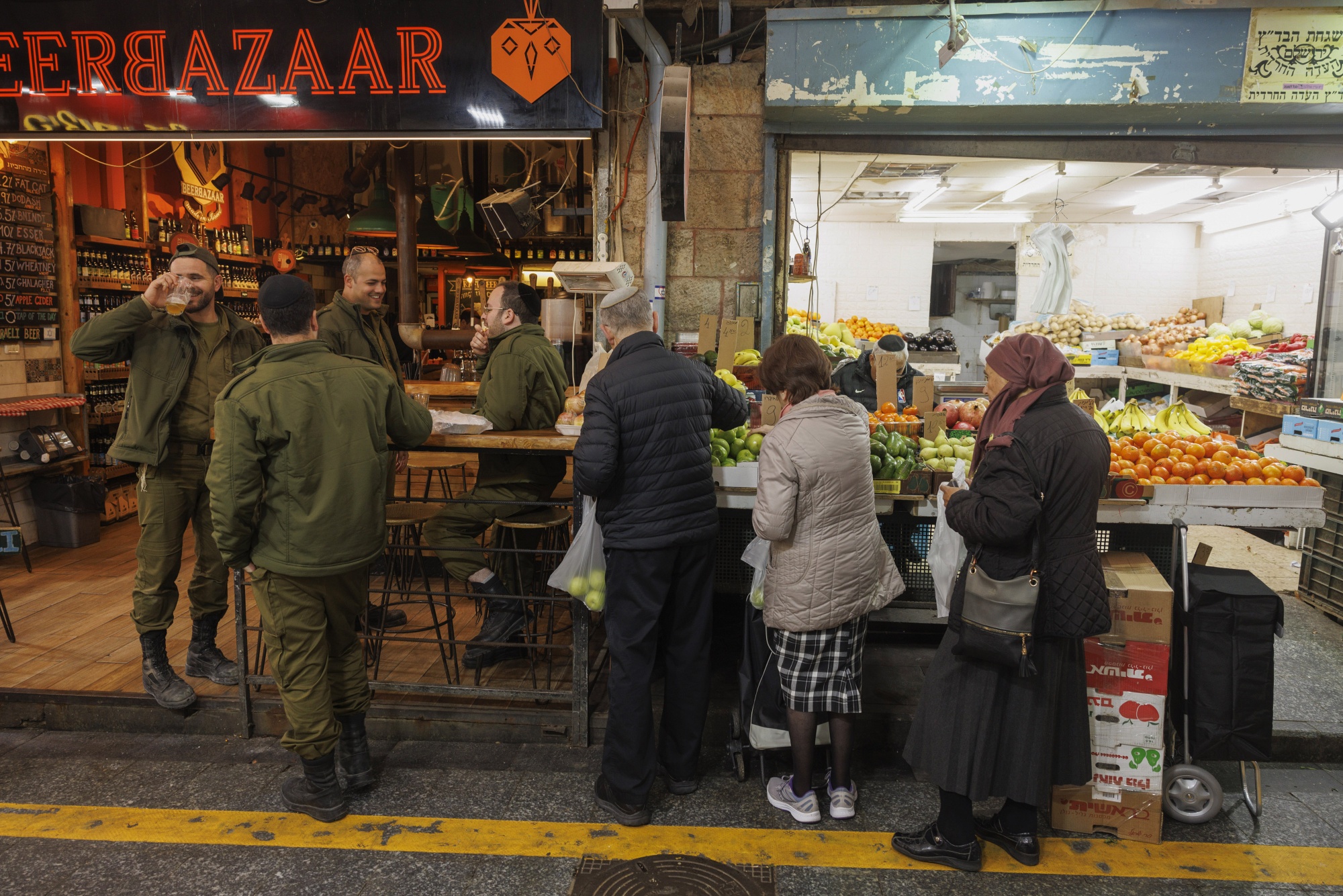 士兵们在耶路撒冷的马哈内耶胡达市场。