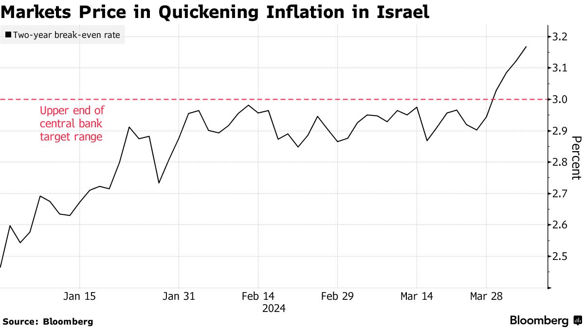 不断升级的紧张局势导致以色列通胀预期在最近几天恶化,这是通过实现利率计算的。两年期的实现利率已经上升到3.17%,高于中央银行的1%至3%的目标范围。