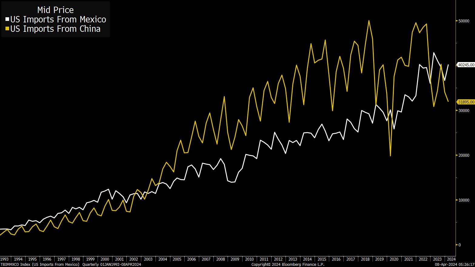 话虽如此,中国不再是美国最大的进口来源国。墨西哥是。这是图表: