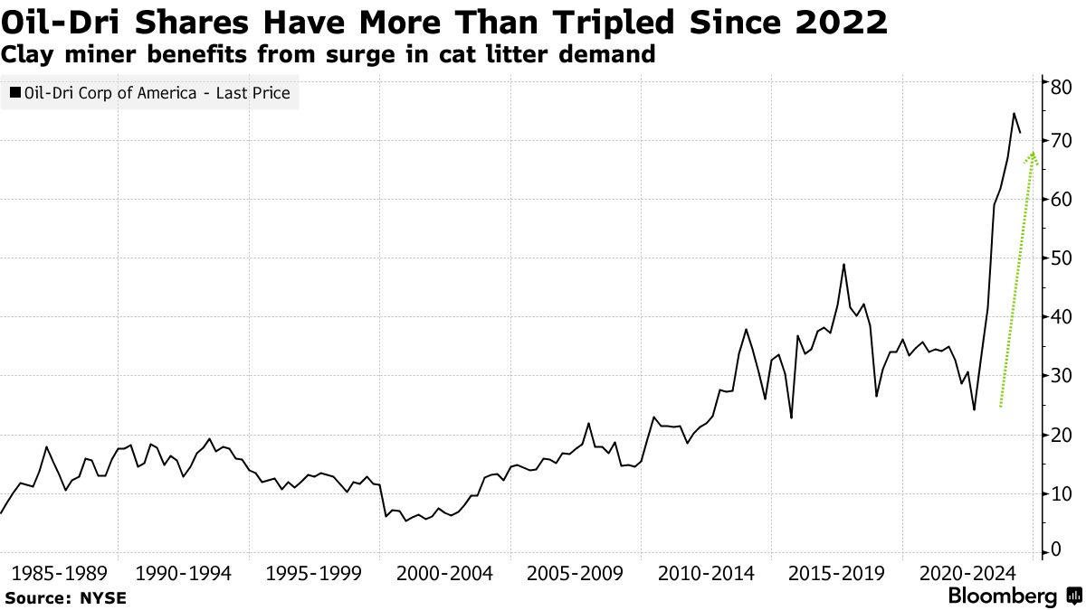 Oil-Dri公司,一家开采用于猫砂到精炼食用油生产的粘土的公司,去年股价翻倍并在3月创下历史新高。这家总部位于芝加哥的公司表示,猫砂销售每年增长约3.5%至4%,超过了美国人口增长的速度。