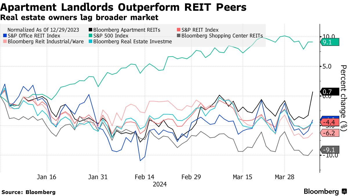 公寓房东现在是房地产投资信托行业中表现最好的群体。在周一的涨幅之后,该行业今年上涨了0.9%,而在上周五收盘时下跌了超过3%。