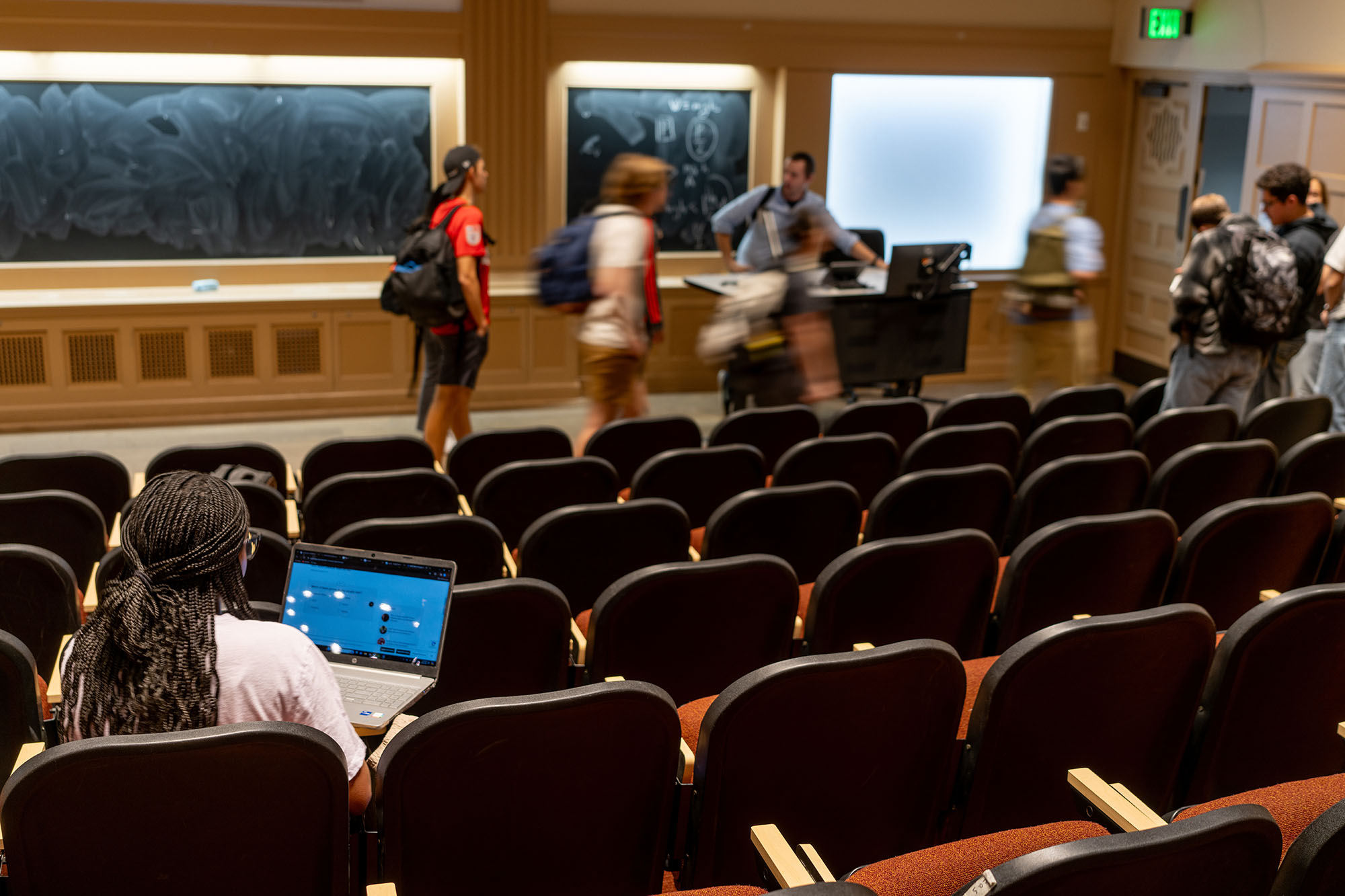 一名学生在德克萨斯大学奥斯汀分校的讲堂里坐着,当课程结束时。