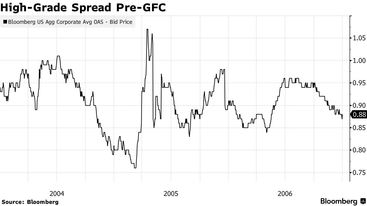 在那三年里,投资级美国公司债券的平均利差约为91个基点,接近上周五的89个基点。