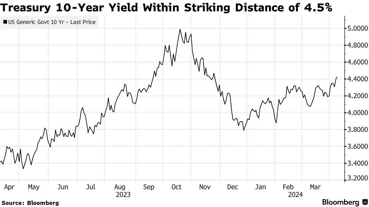 韩国和澳大利亚的基准股指上涨。香港期货也指向上涨。美国10年期收益率在升至去年11月以来的最高水平后稳定,接近心理重要的4.5%水平。交易员对美联储今年三次四分之一利率降息的信心迅速消退,市场现在更倾向于只有两次降息。