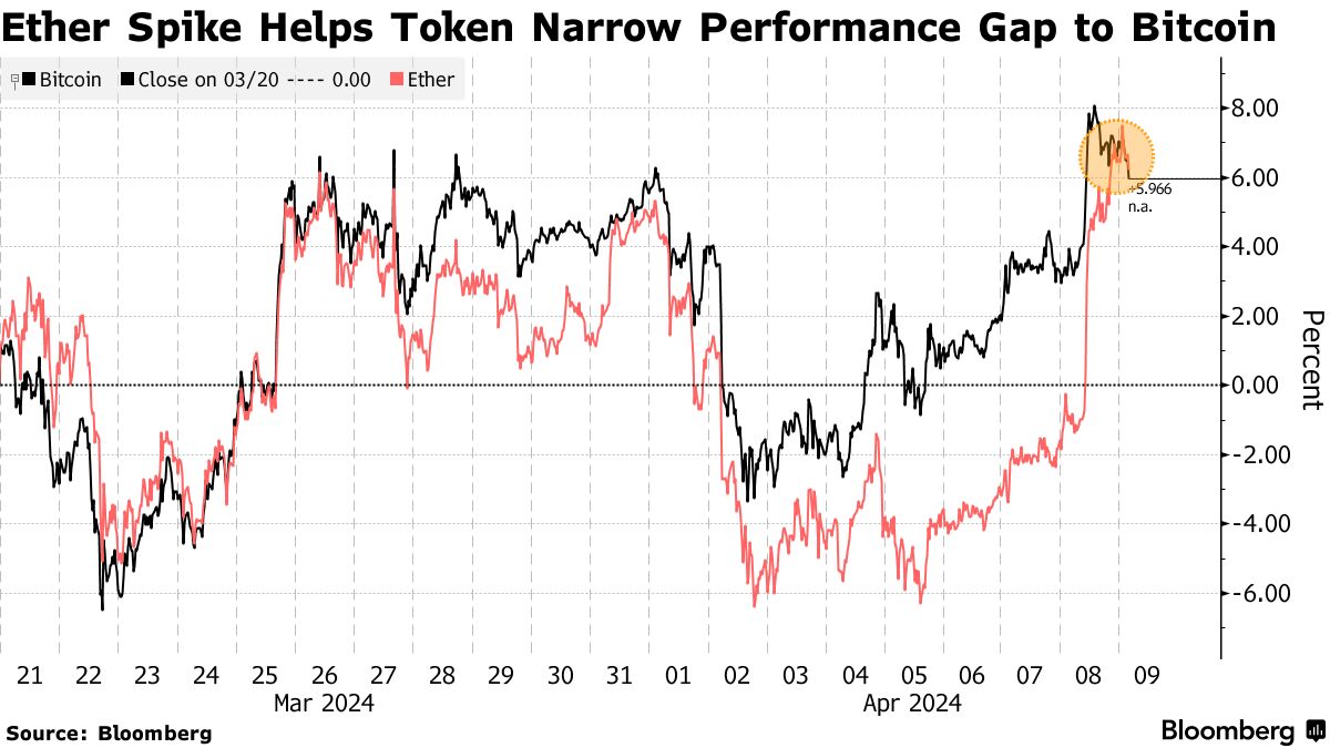 以太坊(ETH)在美国现货ETF猜测的推动下激增,超过了比特币(BTC)- 彭博社
