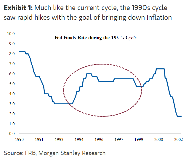 许多经济学家将1990年代美国货币周期作为当前时期可能展开的模板之一 — 即,积极的紧缩后只有温和的宽松周期,然后再次加息。