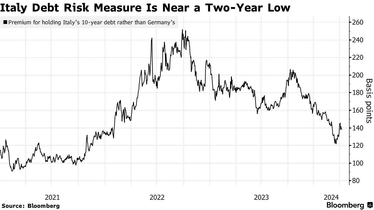 尽管如此,他公布的更高债务前景——虽然仍低于该国先前经历的国内生产总值140%水平——可能会在意大利债券溢价于德国债券的额外收益率降至两年低点之后,引发对梅洛尼政府的更大投资者审查。