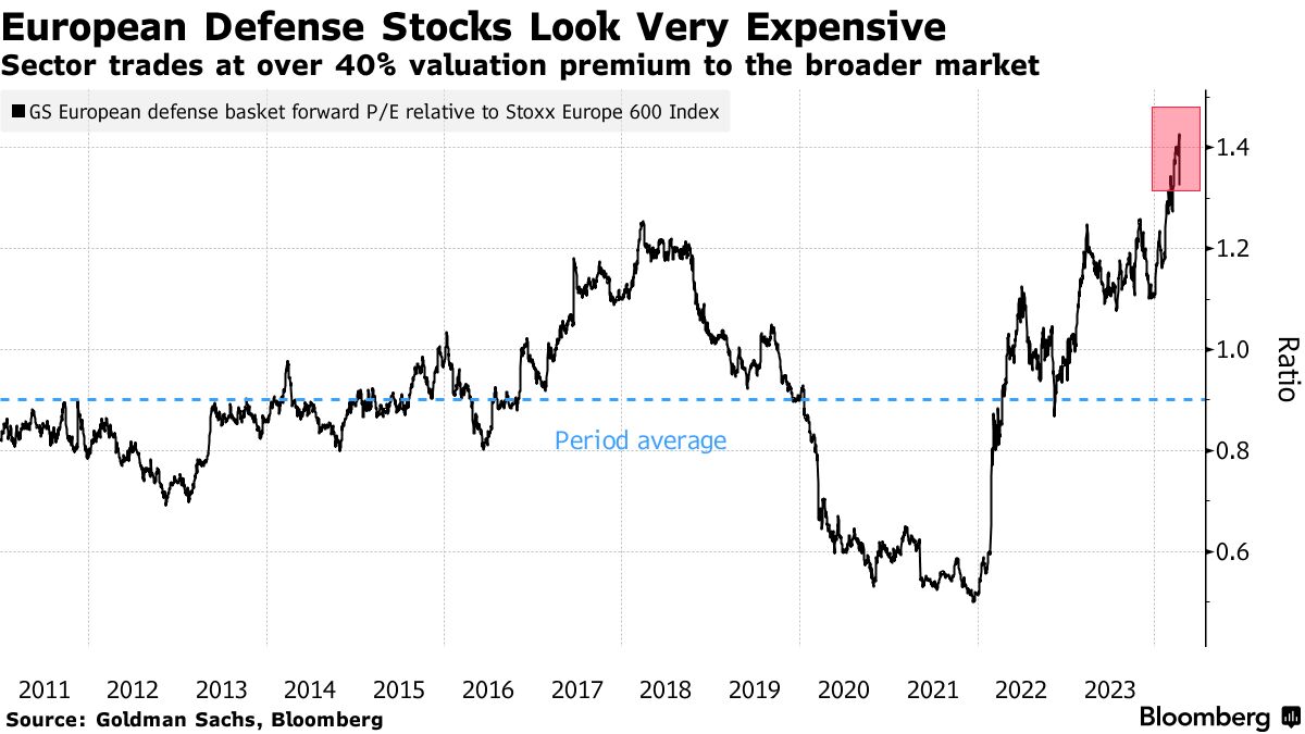 阿拉德指出,国防股票现在以接近20倍的未来收益交易,比Stoxx欧洲600指数高出45%的历史纪录溢价。他说,从历史上看,它们曾以10%的折价交易。