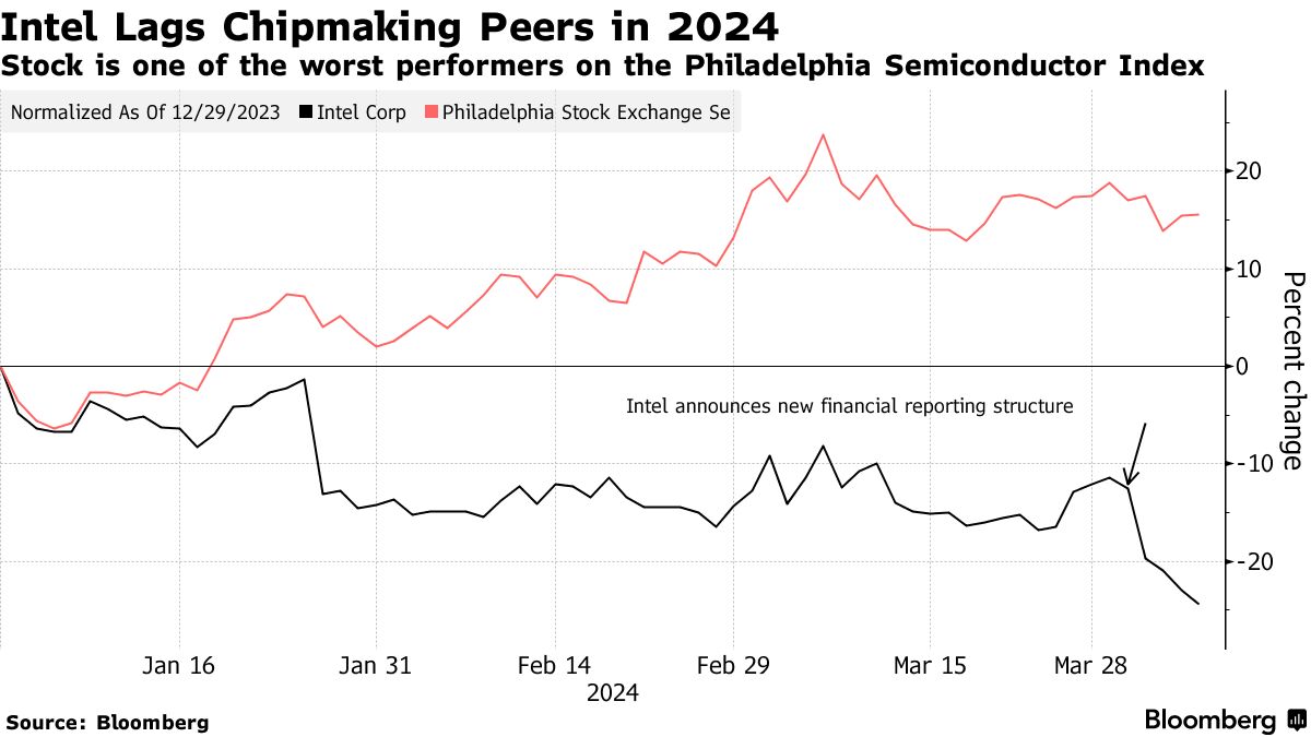 自4月2日发布有关其新拆分的晶圆厂部门的更新以来,公司股价已经下跌了15%,揭示了该部门运营亏损前景不容乐观。这使得其年初至今的跌幅达到25%,与其在2023年90%的涨幅形成鲜明对比,远远落后于同行公司如英伟达公司和超威半导体公司的强劲回报。它还成为了今年费城半导体指数中表现第二糟糕的股票,仅次于Wolfspeed Inc。