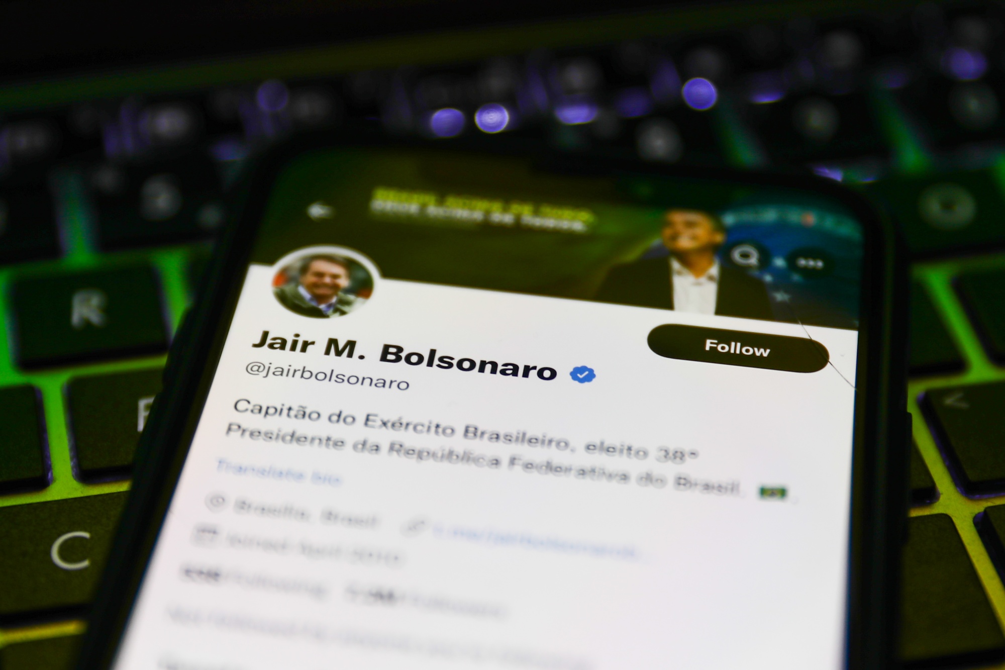巴西总统贾尔·博尔索纳罗的推特信息在2022年1月的一张照片中显示在手机屏幕上。(