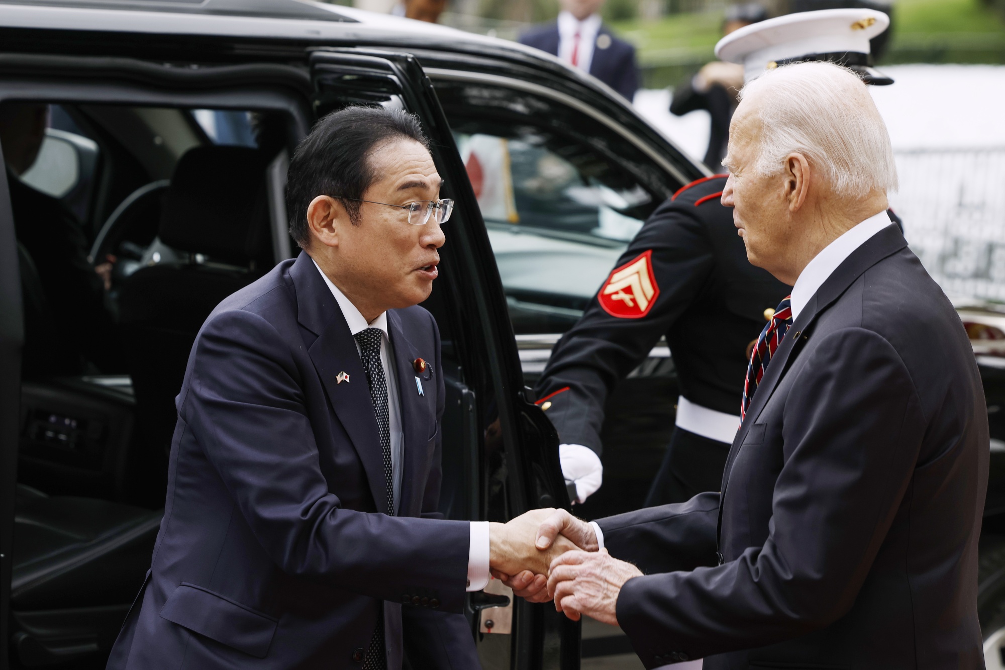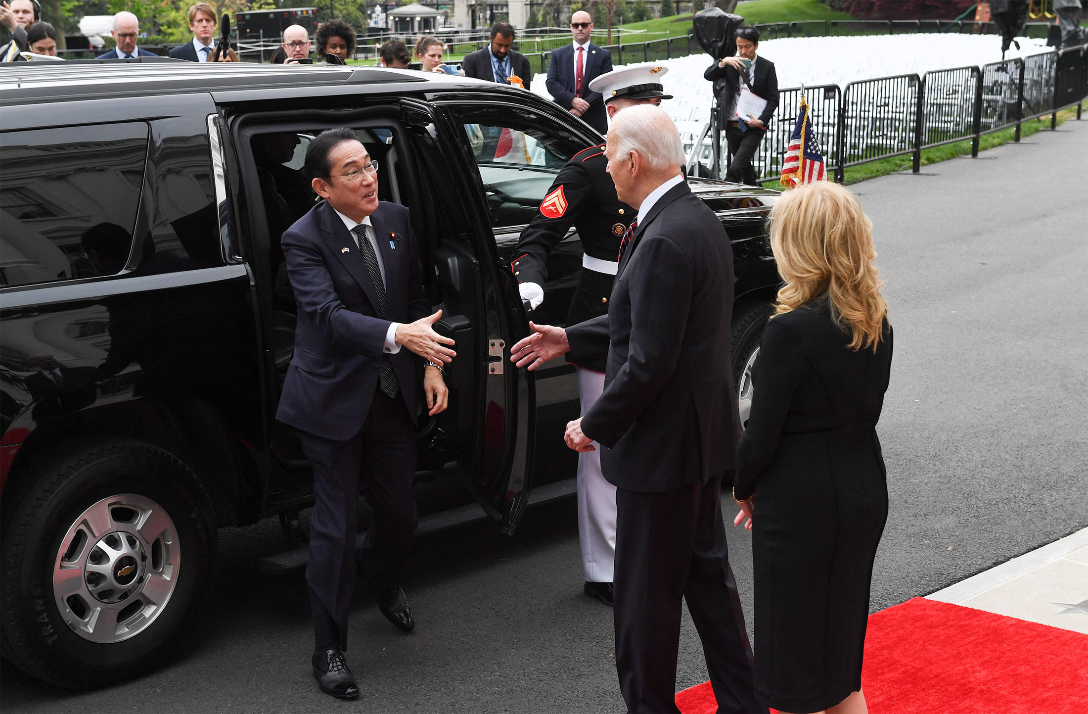 乔·拜登在华盛顿特区白宫迎接日本首相岸田文雄,左,于4月9日。