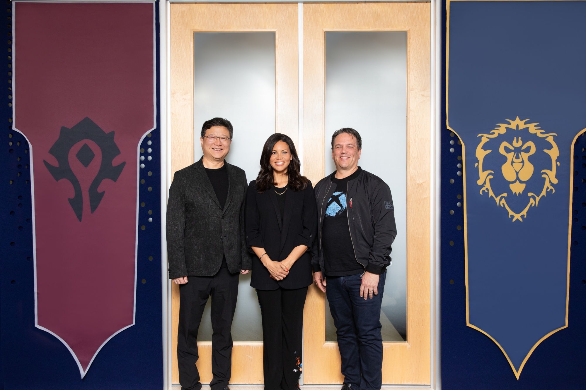 网易CEO丁磊(左)、暴雪总裁乔安娜·法里斯(中)、微软游戏CEO菲尔·斯宾塞。来源:暴雪娱乐阅读更多: 网易猛烈抨击暴雪,魔兽之争升级
