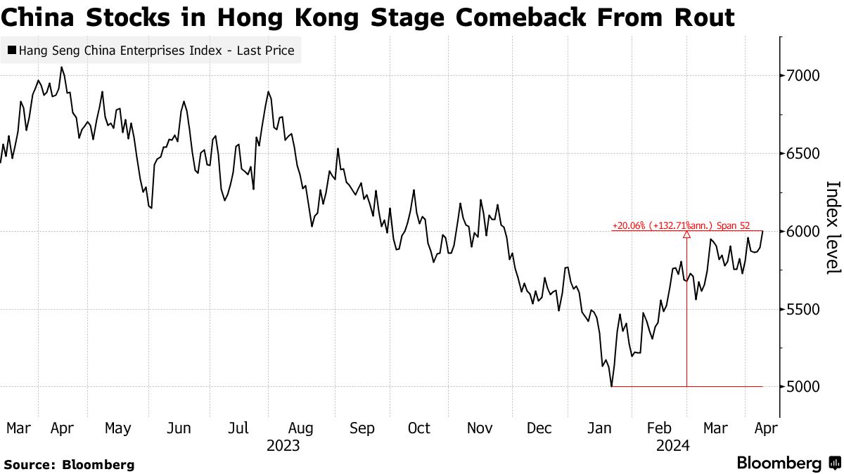 中国股票在香港反弹20%,进入技术性牛市-彭博社