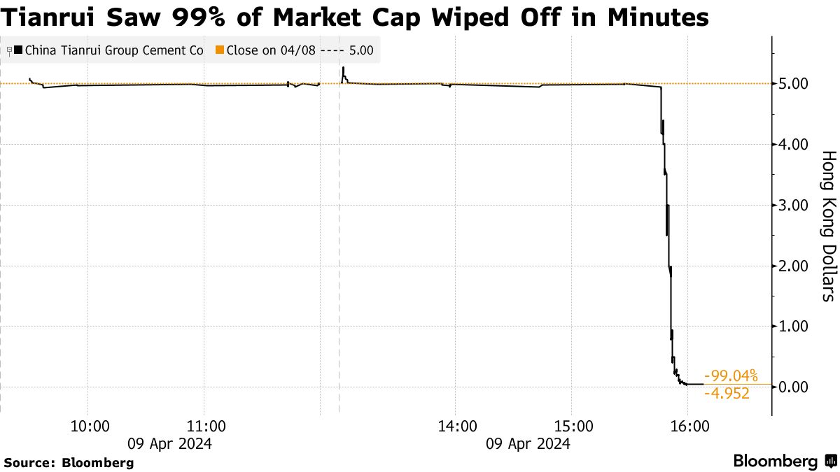 总部位于河南省中部的天瑞股价周二暴跌99%,至约0.05港元,将其市值削减至1.41亿港元(约合1800万美元)。在抛售过程中,约2.81亿股,即公司自由流通股的三分之一,易手。其中,超过8000万股是在被称为收盘竞价的最后几分钟内交易的。