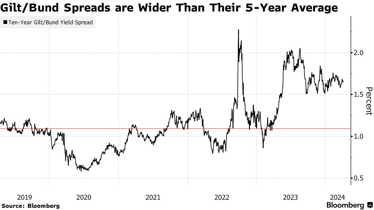 然而,英国10年期债券的收益率几乎是其德国对应债券利率的两倍,它们之间的利差远高于它们的五年平均水平。