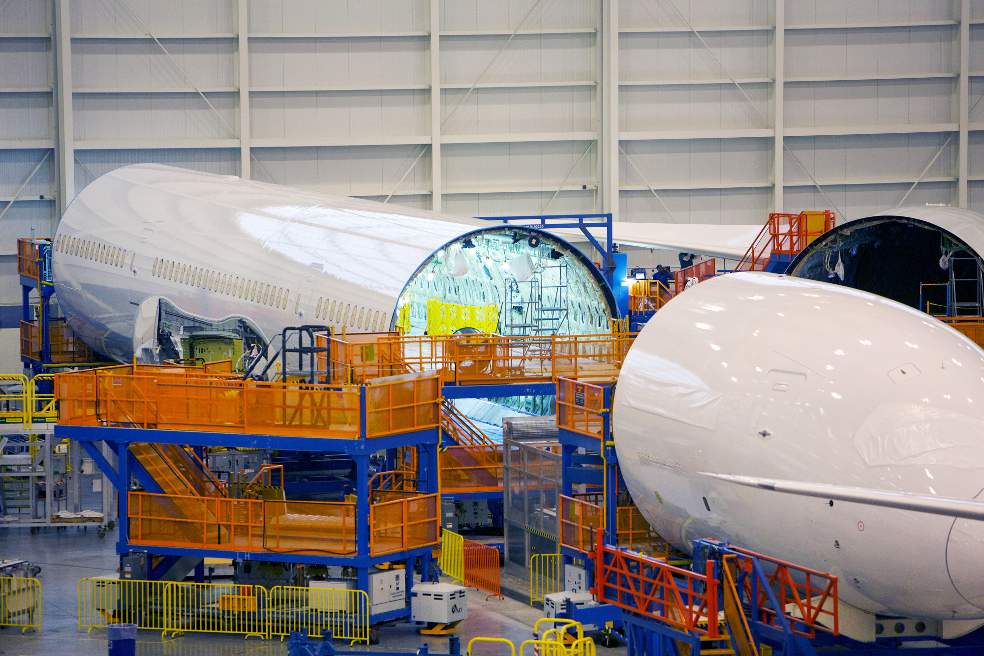 波音梦幻客机787的部件在生产线上来源:彭博社1月5日,一架几乎全新的波音737 Max 9的机身部件在起飞后不久就脱落了。鉴于此,737的生产受到了限制。现在在美国联邦航空管理局的严格监督下进行。