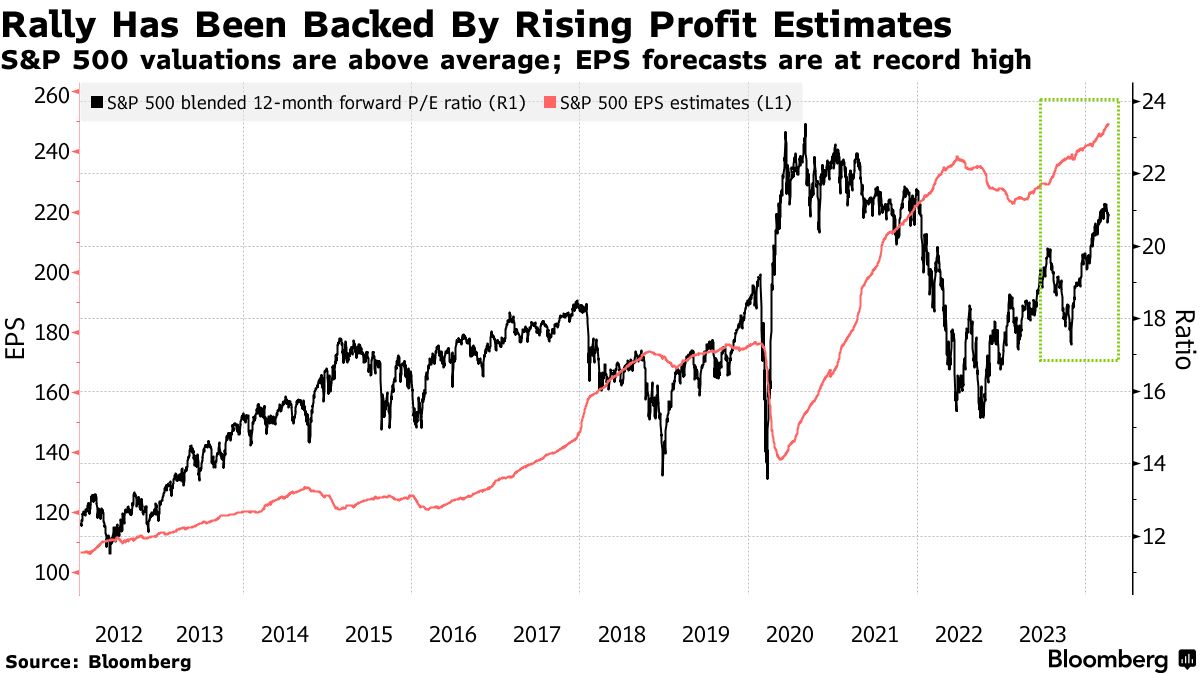 盈利预测上升减轻了对广泛股票基准处于泡沫中的担忧。今年股市上涨了9%,标普的估值远高于过去20年的平均水平,该指数已经比彭博上个月跟踪的策略师的平均目标高约4%。