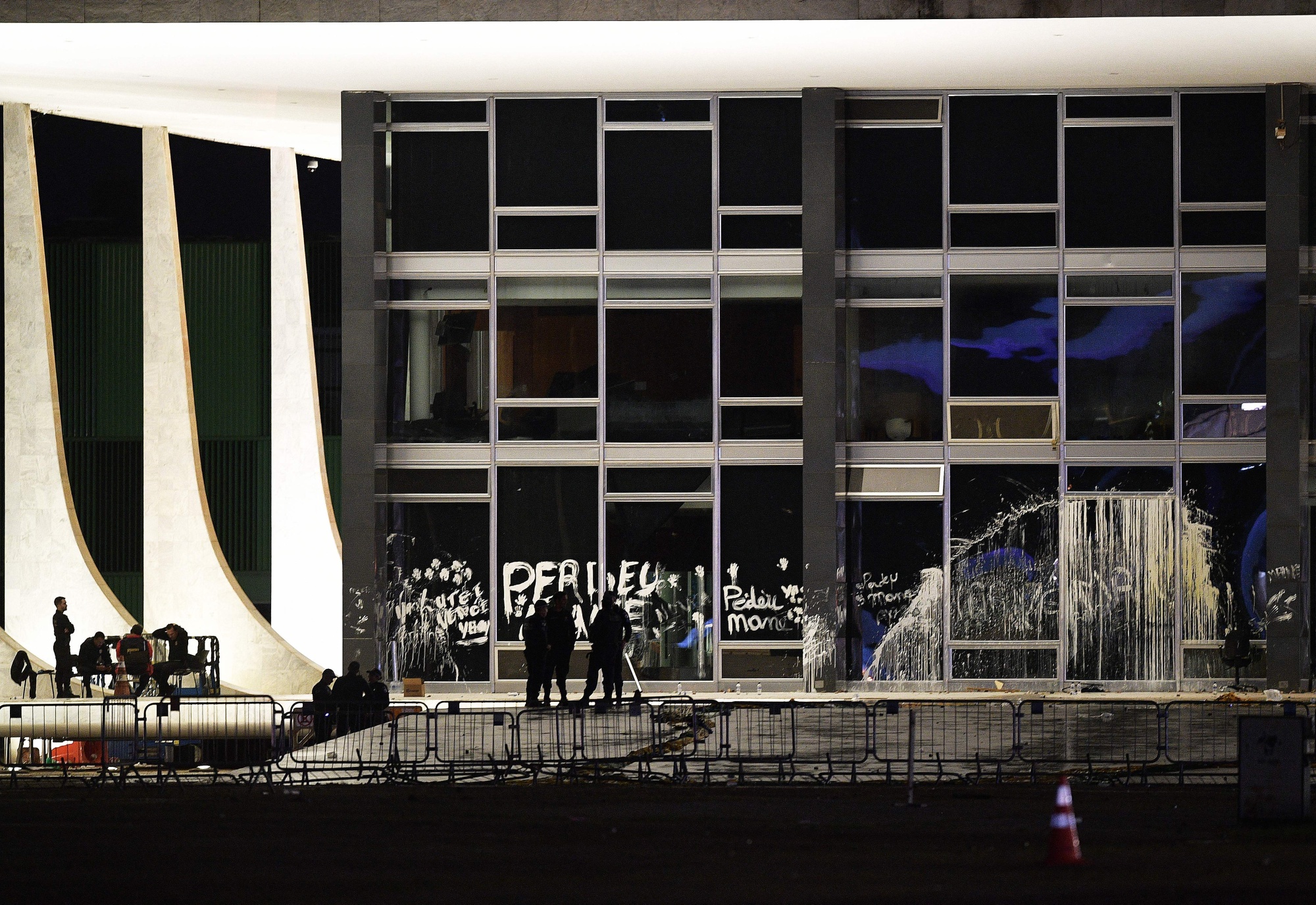 巴西前总统雅伊尔·博尔索纳罗支持者在2023年1月8日在巴西利亚对最高法院造成的油漆和涂鸦破坏。摄影师:CARL DE SOUZA/AFP对于巴西最高法院来说,这是一个熟悉的位置,过去十年里,它经常激怒左右两派,经常面临关于过度行使职权的指控,这些指控随着时势的变化而来。