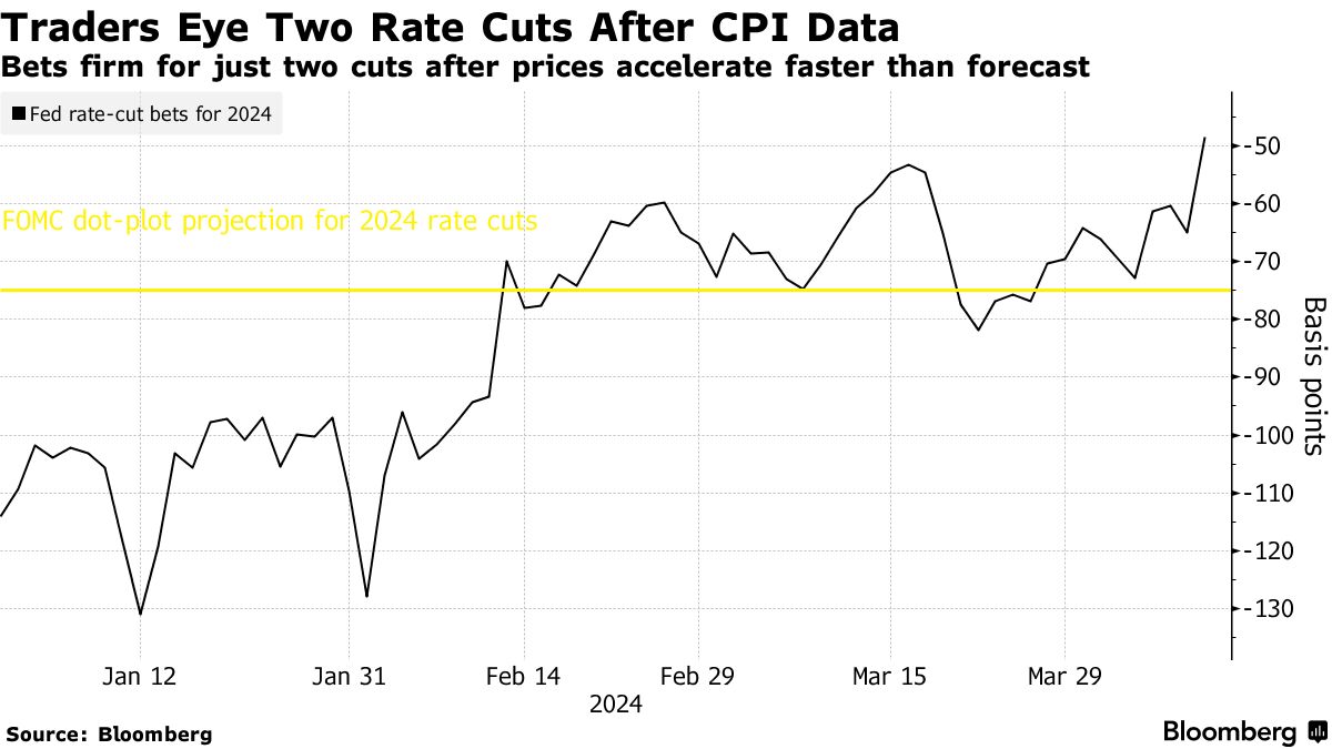 国债收益率飙升,达到今年以来的新高,因为比预期更热的三月通胀数据促使投资者减少他们对今年美国降息幅度的预期。