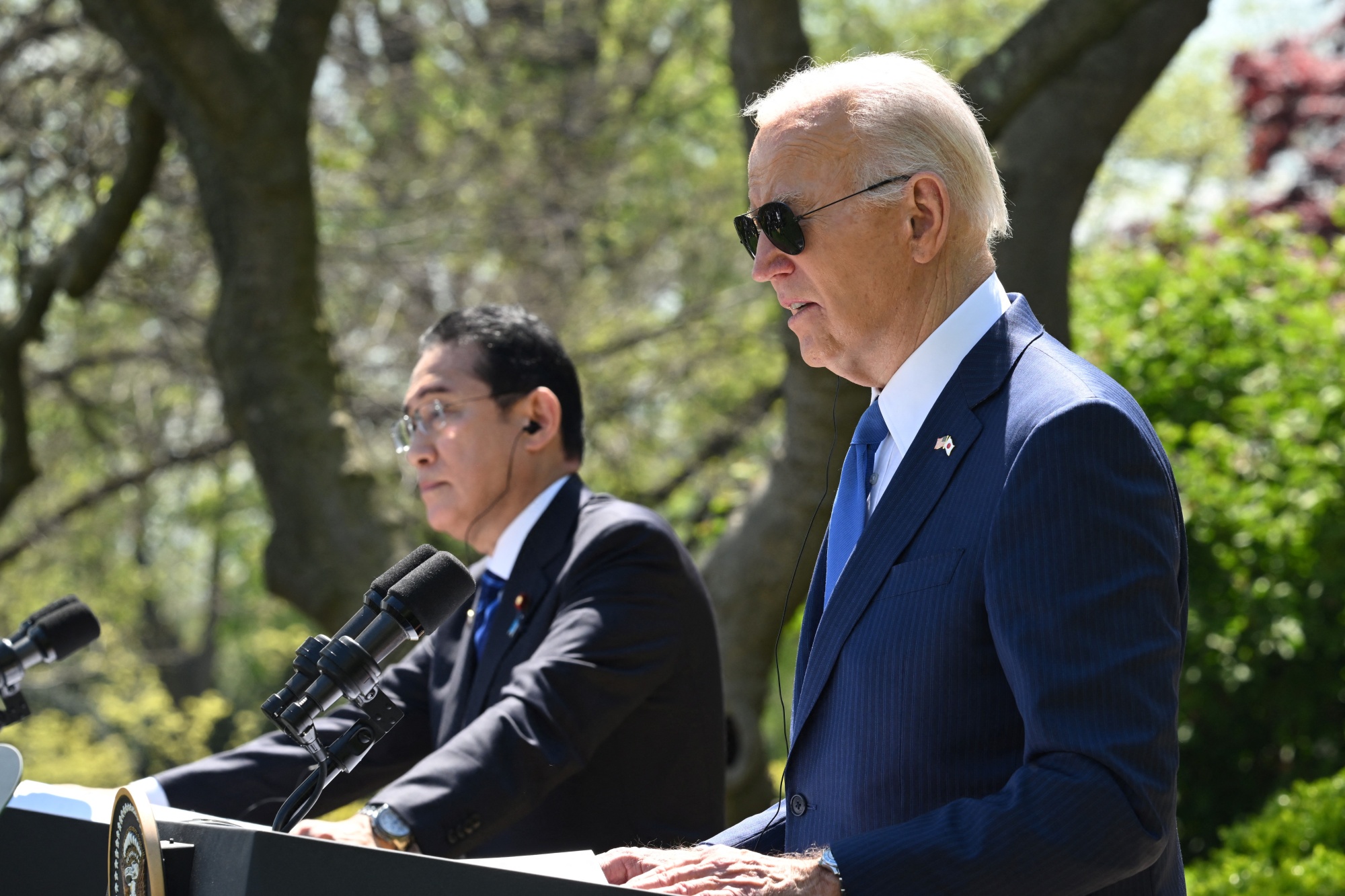乔·拜登在华盛顿特区白宫与岸田文雄举行的联合新闻发布会上讲话,时间为4月10日。