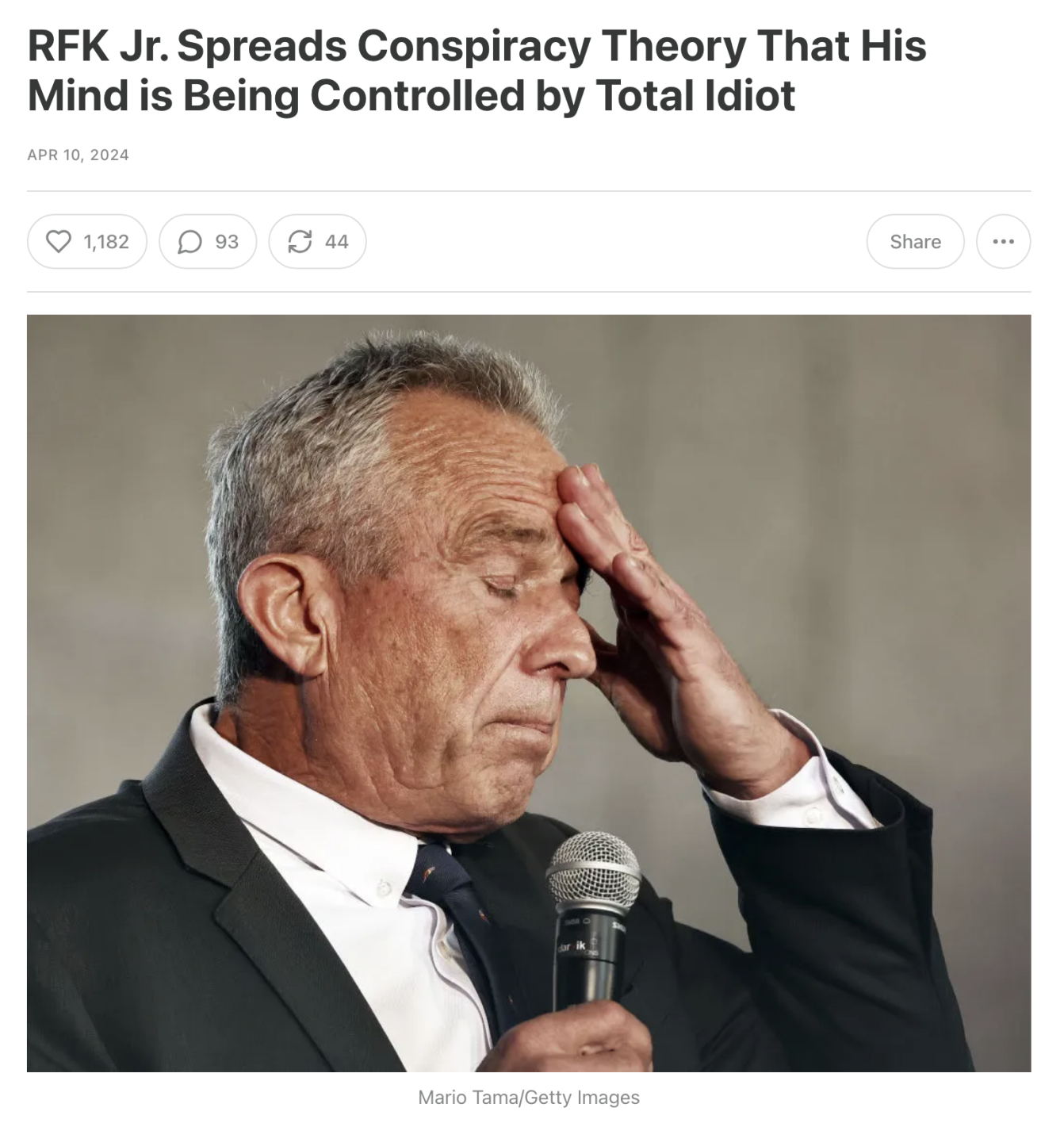 来源:The Borowitz Report](https://www.borowitzreport.com/p/rfk-jr-spreads-conspiracy-theory)“很难辨别一个在政治界拥有最为著名姓氏之一,早期事业建立在环境问题、清洁水源、土著权利和其他值得关注的事业基础上的人,是如何沦为一个痴迷于阴谋论和传播疫苗虚假信息的人,”帕特里夏指出。但无论他口中说出多少愚蠢的胡言乱语,选民必须看清他真实的面目:他是拜登的替身。投票给RFK就是投票给那些让亚利桑那州倒退160年的势力。