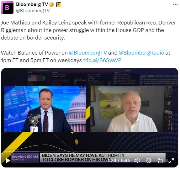 今天在彭博电视台的权力平衡早间版节目中,主持人乔·马修和凯莉·莱因兹采访了前共和党代表丹佛·里格尔曼,谈到众议院共和党内部的权力斗争以及边境安全的辩论。