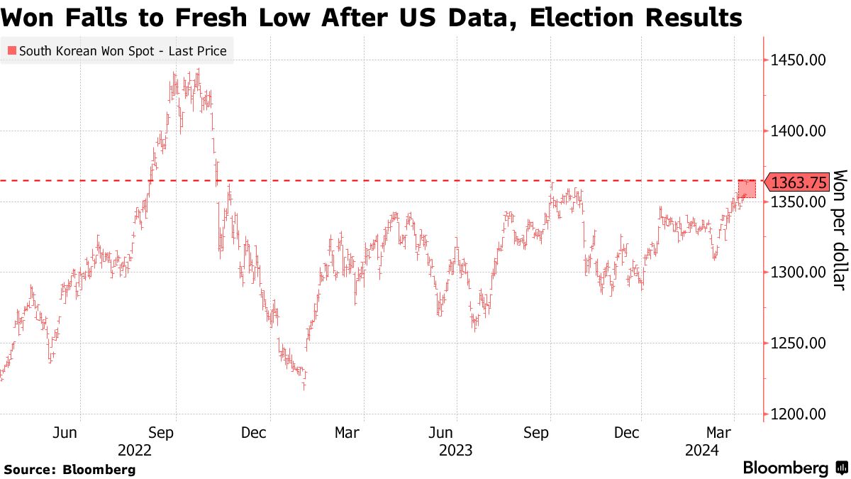 韩元兑美元汇率下跌至最多1,364.85,自2022年11月以来最弱,此前美国通胀上升支撑了美元,中国的消费价格停滞重新引发了对韩国最大贸易伙伴增长乏力的担忧。韩国总统尹锡烈在议会选举中遭受重大失败也对情绪产生了影响。