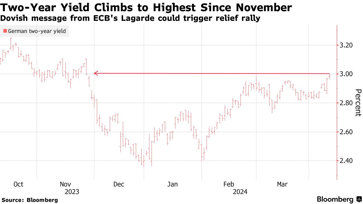 债券下跌,交易员重新评估利率前景。两年期德国国债收益率上涨了四个基点,达到3%,为去年11月以来最高。 欧元在周三经历了一年多以来最糟糕的单日跌幅后,保持稳定。英国国债下跌,导致各期限收益率上涨了多达10个基点。