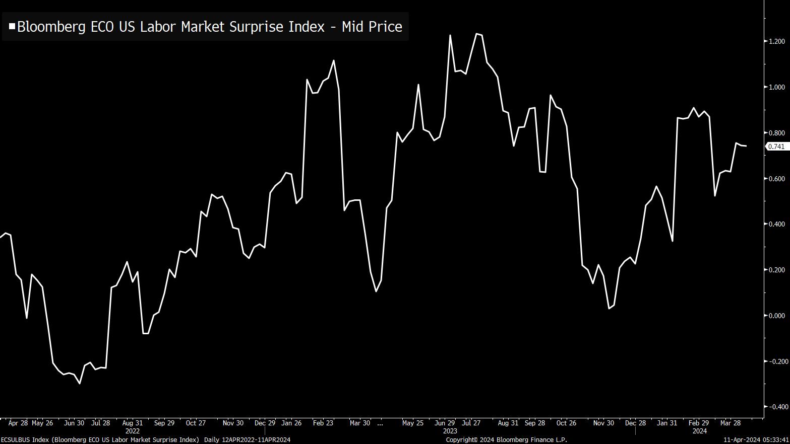 昨天我们得到了三月份的消费者价格指数(CPI),令人失望的高。这是在一月和二月的失望之后。由于三次构成一种趋势,人们再次严重担心回到美联储2%目标的进展要么停滞不前,要么倒退。与此同时,对于降息的预期不断推迟到未来,人们开始质疑近期是否会有任何降息,或者下一次利率调整是否会是加息。2023年下半年我们看到的真正令人鼓舞的一点是通货紧缩伴随着劳动力市场的稳定。这表明实际上你可以让价格增长下降,而不会大幅提高失业率。但在这一系列通胀数据之后,可能会有另一轮人们开始怀疑劳动力市场是否需要进一步削弱以控制通货膨胀。
