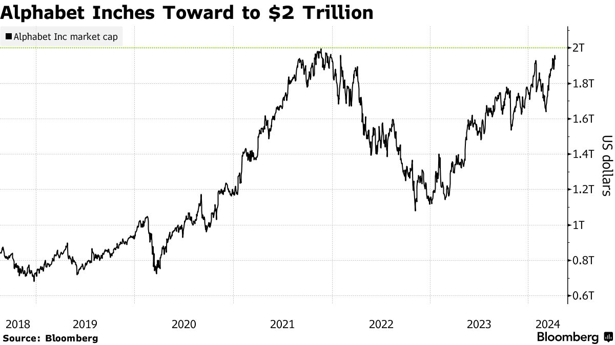 字母公司朝着2万亿美元迈进,投资者为人工智能进展欢呼-彭博社