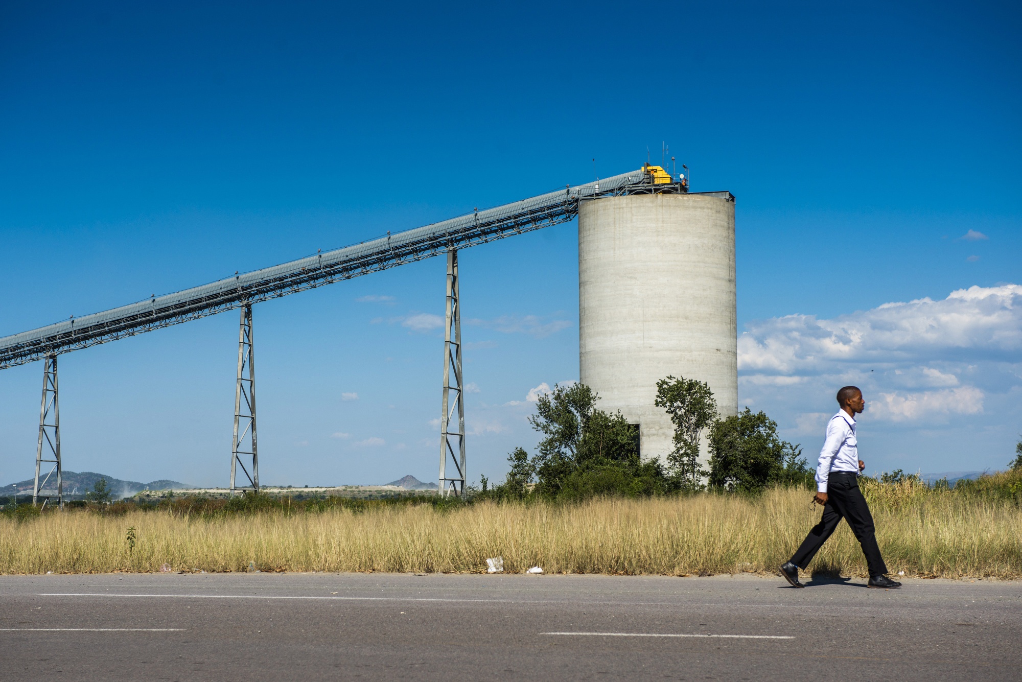 一位居民经过南非Rustenburg的Sibanye Stillwater Ltd.矿山的传送带。