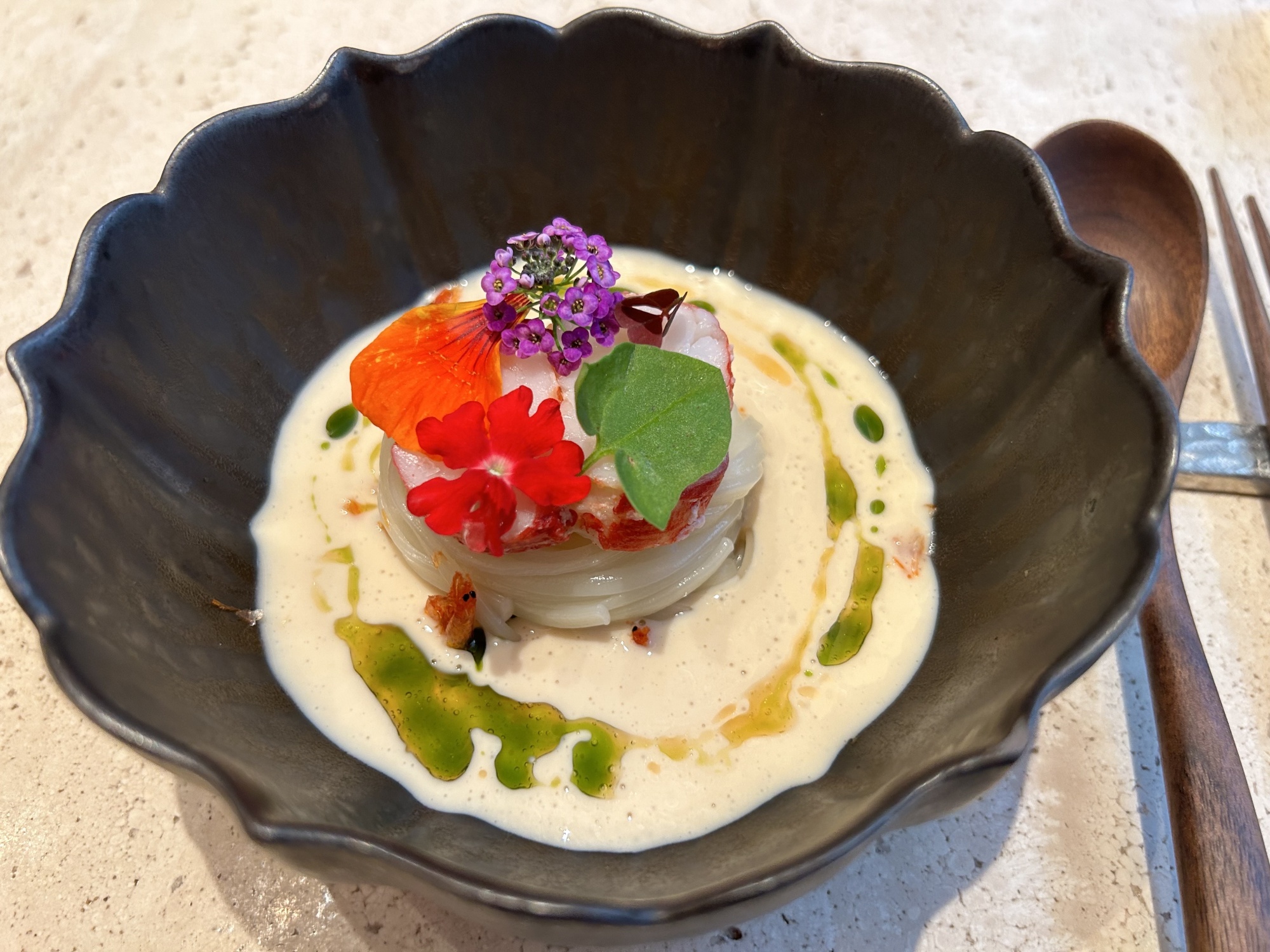乌冬面、大豆、龙虾和花卉。摄影师:洪金山/Bloomberg需要注意的一点是:Mora也许离中环只有10分钟的车程,但一定要给自己多几分钟找到这个地方,因为它隐藏在一个古董摊位后面的小巷里。我在同一个街角转了两次,直到一个报摊的人可怜我,告诉我它在哪里。