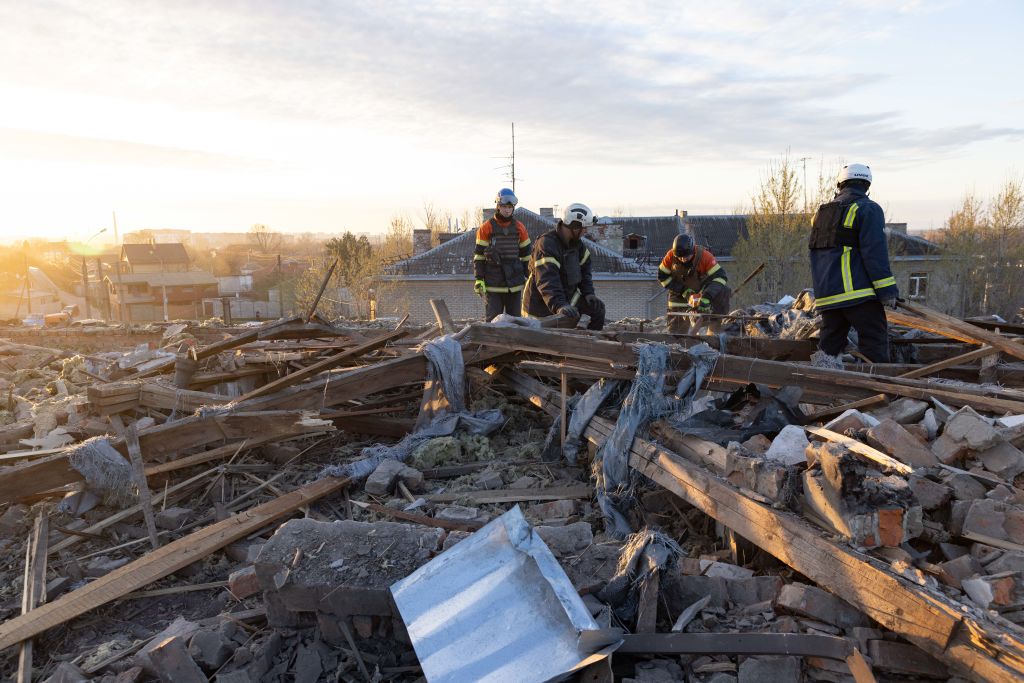 俄罗斯无人机袭击后的哈尔科夫救援人员,4月4日。摄影师:叶甫根·提托夫/全球图片乌克兰/盖蒂图片社