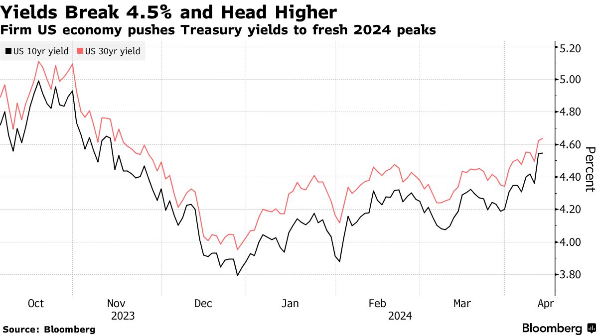 进一步的经济韧性延迟了美联储降息的可能性,这被视为重新测试10年期和30年期国债收益率在5%以上的高点的前奏。10年期收益率在4.5%的水平——去年年底还低于4%——预计会引发一波购买热潮,但这一预期尚未实现。自周三超过这一门槛以来,10年期收益率一直保持在这个水平以上。