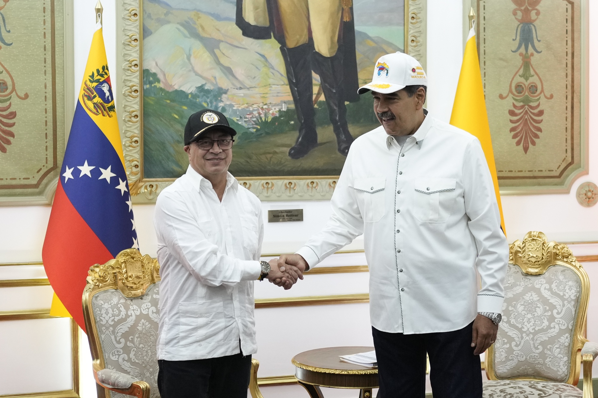 尼古拉斯·马杜罗,委内瑞拉总统,右,和古斯塔沃·佩特罗,哥伦比亚总统,在2024年4月9日星期二在委内瑞拉加拉加斯的米拉弗洛雷斯宫。摄影师:马蒂亚斯·德拉克鲁瓦/彭博社美国国家安全委员会拒绝发表评论。委内瑞拉信息部未立即回应置评请求。