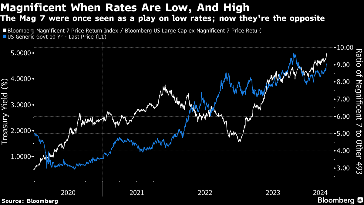 这是怎么发生的?股票看起来并不明显便宜。今年以来,它们甚至还没有下跌超过2.5%,被普遍认为是需要修正的。不仅如此,领头的是所谓的 七巨头 科技平台公司,苹果公司近一年来表现最好,亚马逊公司达到了693个交易日以来的新纪录。奇怪的是,几年前,购买这些股票的理由是它们有很长的“期限” — 意味着它们的收益将来很远,因此以较低的利率贴现将特别有利。这个论点总是有点 牵强,但并没有阻止人们在这一基础上购买。因此,有一段时间,七巨头和10年期国债收益率之间存在明显的反向关系。但现在,不知何故,大型科技股票正在冲向新高,就在债券收益率飙升之际: