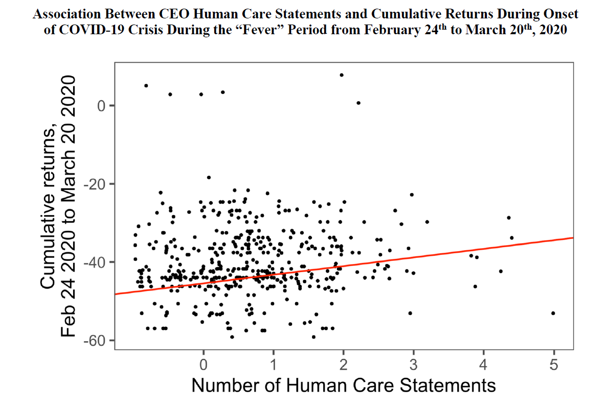 最新研究更有趣的地方在于,它微妙地探讨了危机沟通的实用性与内在动机之间的关系。虽然研究发现这些所谓的人道主义表态与股价之间存在统计学显著的关系,但图表显示这种关系并不是非常强烈: