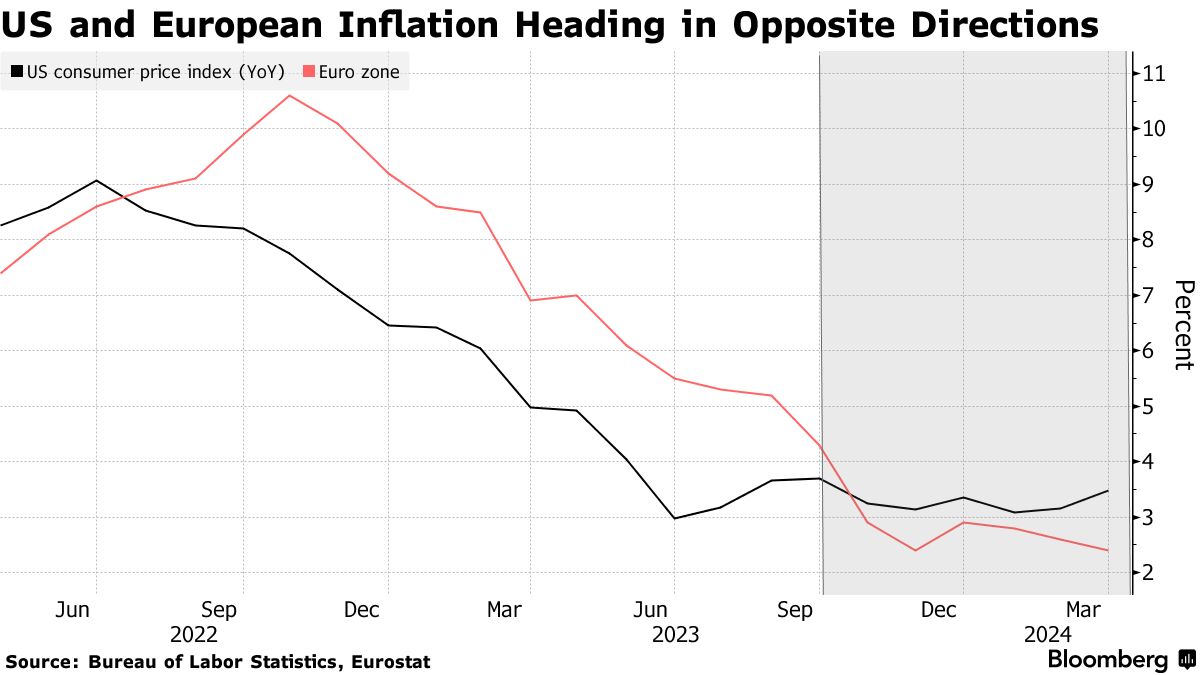 这些言论是在美国通胀数据发布超出预期并引发对货币宽松赌注迅速重新定价之后发表的。市场现在认为欧元区,最近的消费价格数据低于预期,将在2024年看到三次降息,而美联储将少于两次。