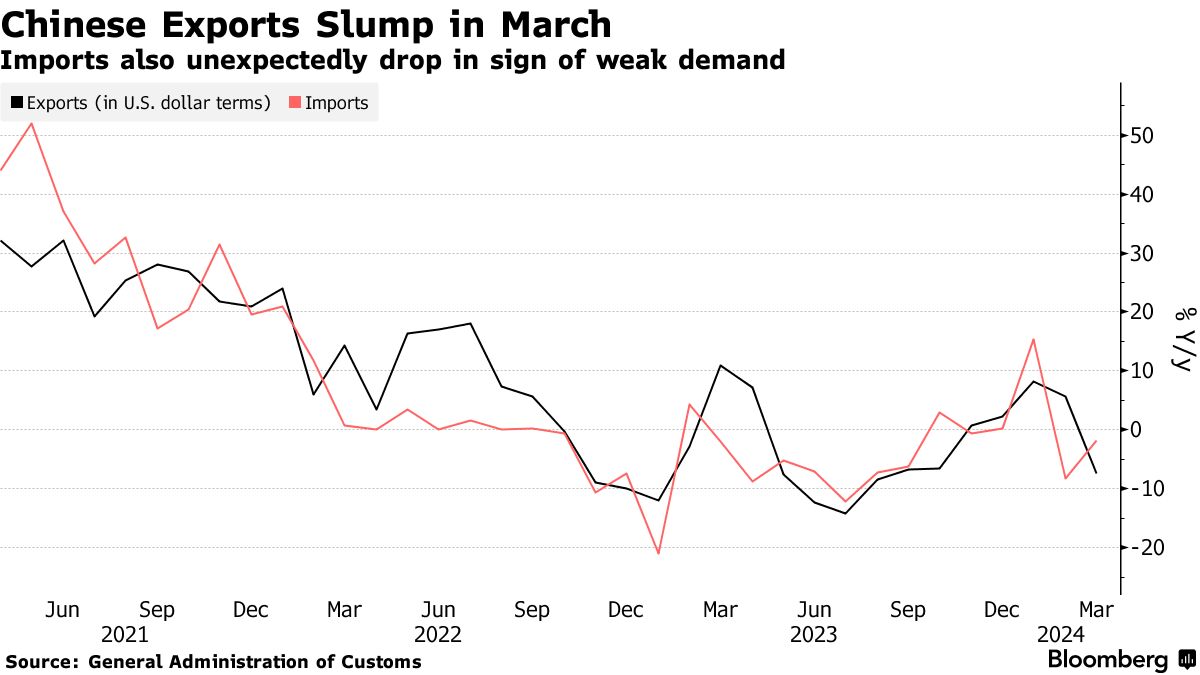 **中国的出口在3月份下滑。**以美元计算,上个月中国的出口同比下降了7.5%,进口下降了1.9%,均低于预期,这对全球需求推动增长的希望构成打击。