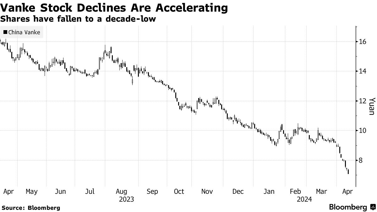 万科股价本周在深圳暴跌13%,创下自2021年以来的最大跌幅,并收于十年来的最低点。到2027年到期的美元债券交易价低于面值的40美分,即将创下历史最低水平,而到2029年到期的人民币债券也跌至新低。