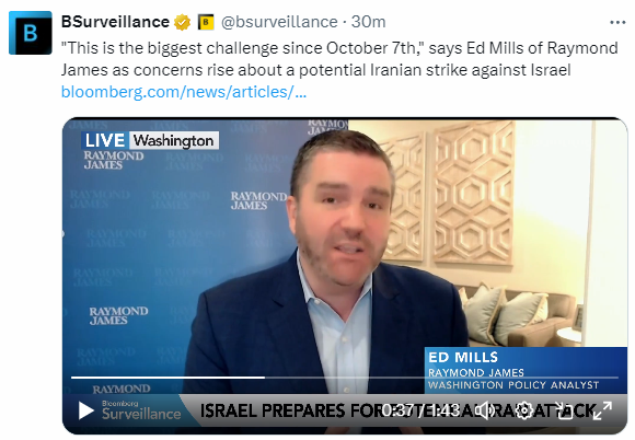 “这就是投资者想知道的,”雷蒙德詹姆斯的Ed Mills说,他表示这种情况是自10月7日哈马斯对以色列发动恐怖袭击引发加沙战争以来最紧张的。彭博最新报道:以色列正准备迎接可能的袭击,最快在接下来的48小时内。