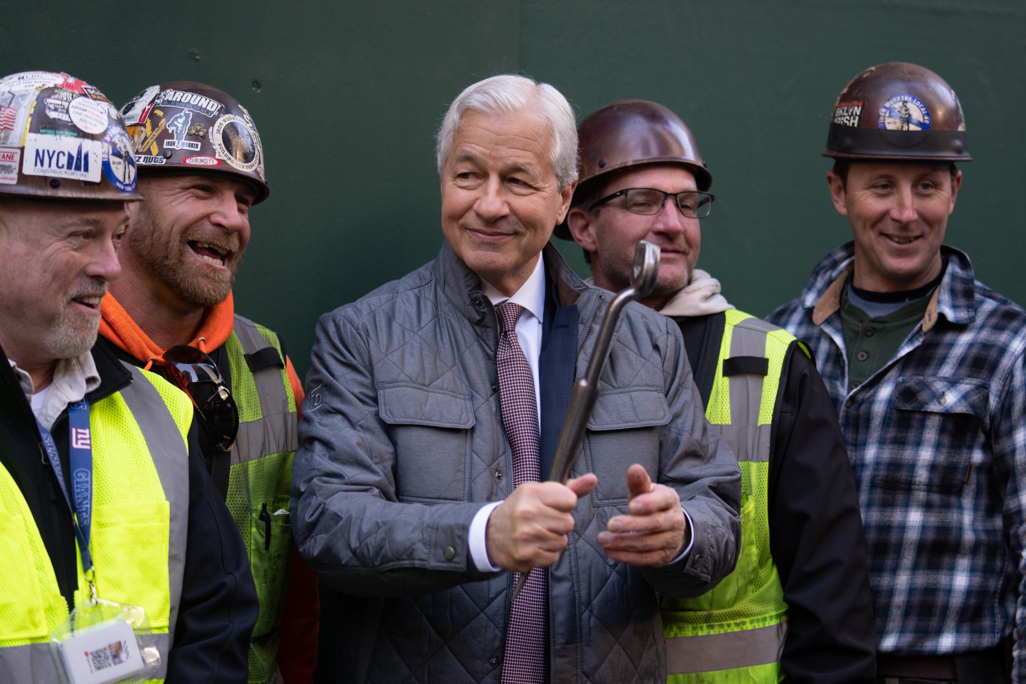 摩根大通(JPMorgan Chase & Co.)首席执行官杰米·戴蒙(Jamie Dimon)去年在曼哈顿新总部的最后一根钢梁被吊起后向钢铁工人致敬。